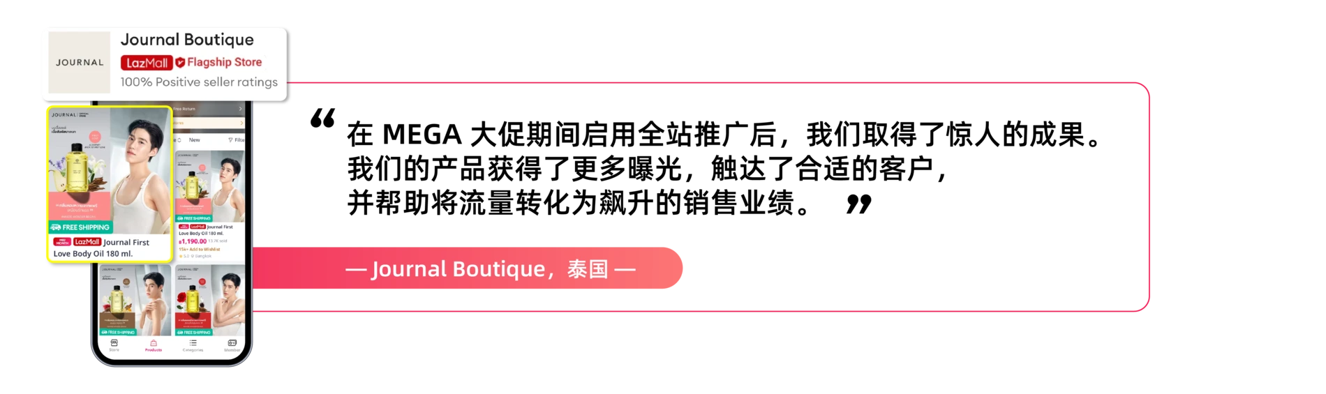 在Lazada 6.6 Mega大促期间,Journal Thailand 实现了卓越的销售增长。通过战略性地启用全新品牌代言人展示焕新形象,并应用 全站推广 提升商品曝光度,Journal 创造了成功公式,帮助他们超越竞争对手,取得突破性的电商成就。