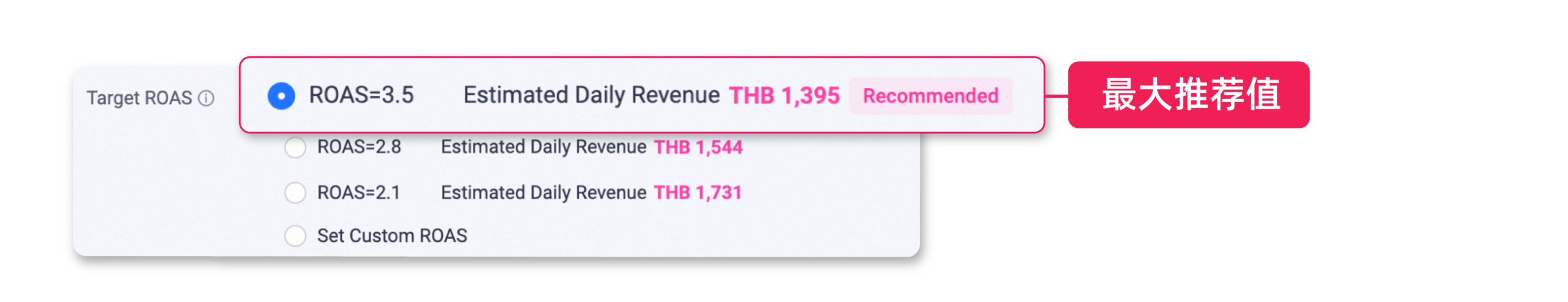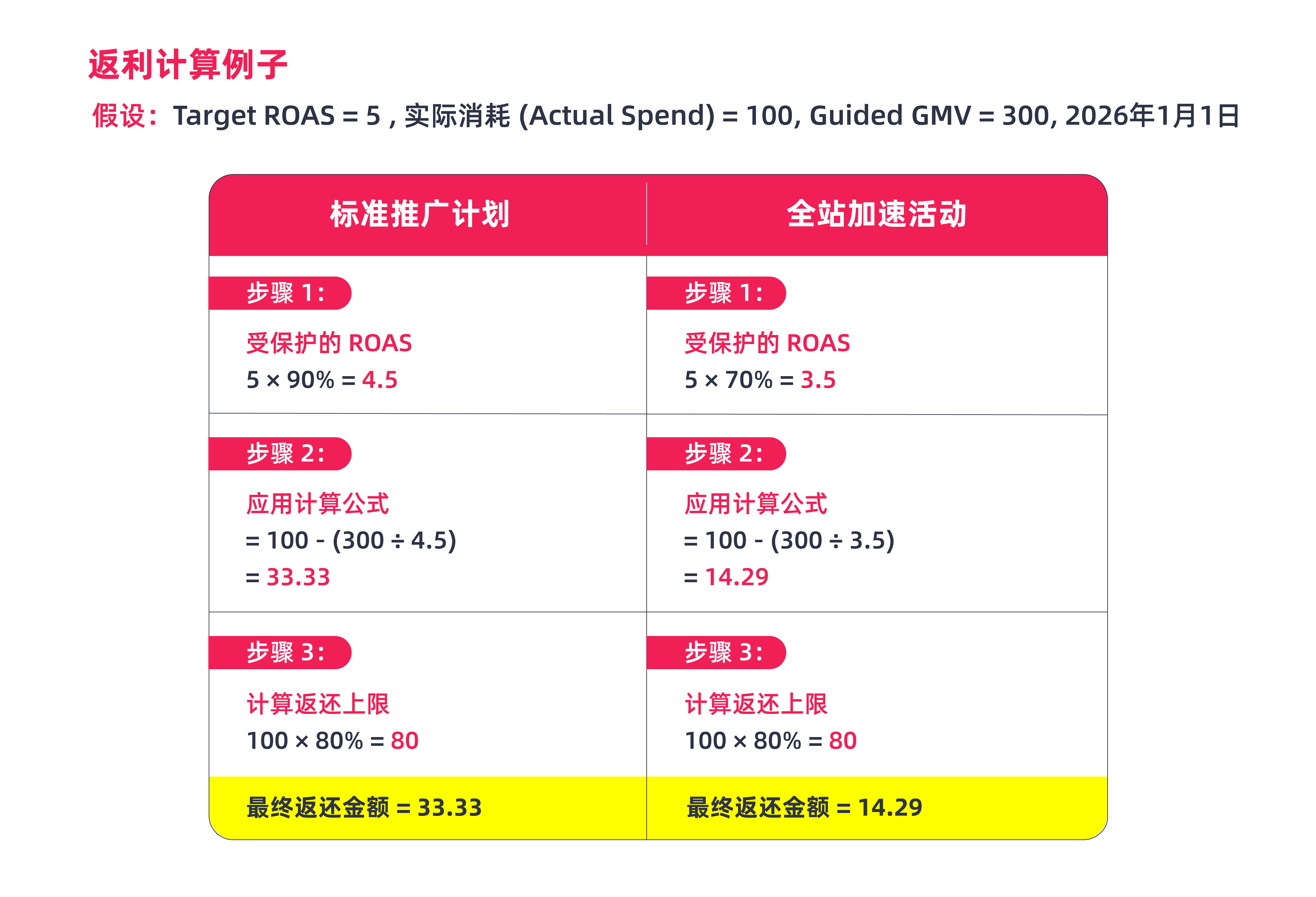 ● 如果商家在同一天接受了系统推荐的新 目标 ROAS,返利将根据所接受的 目标ROAS 数值进行计算。