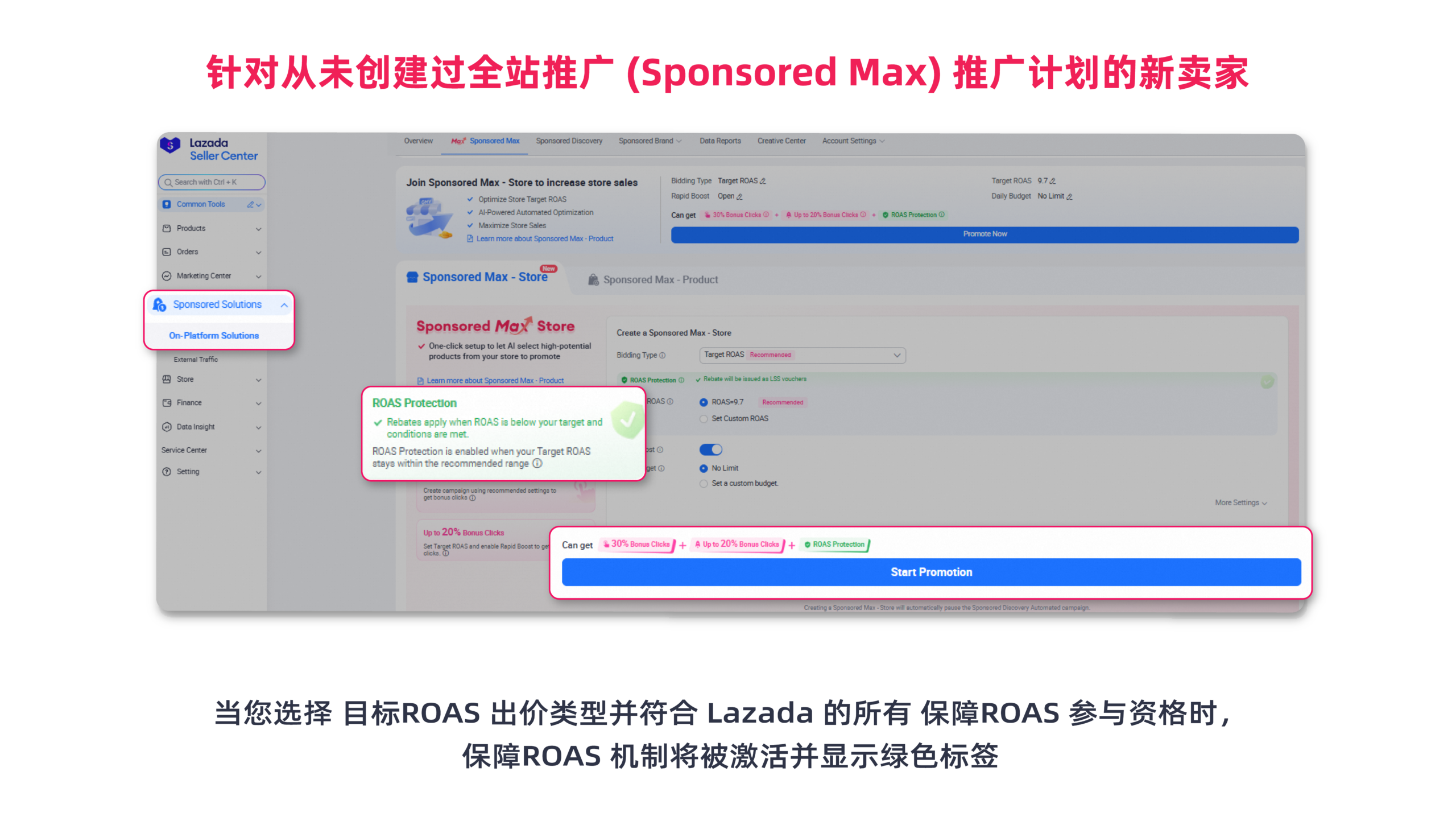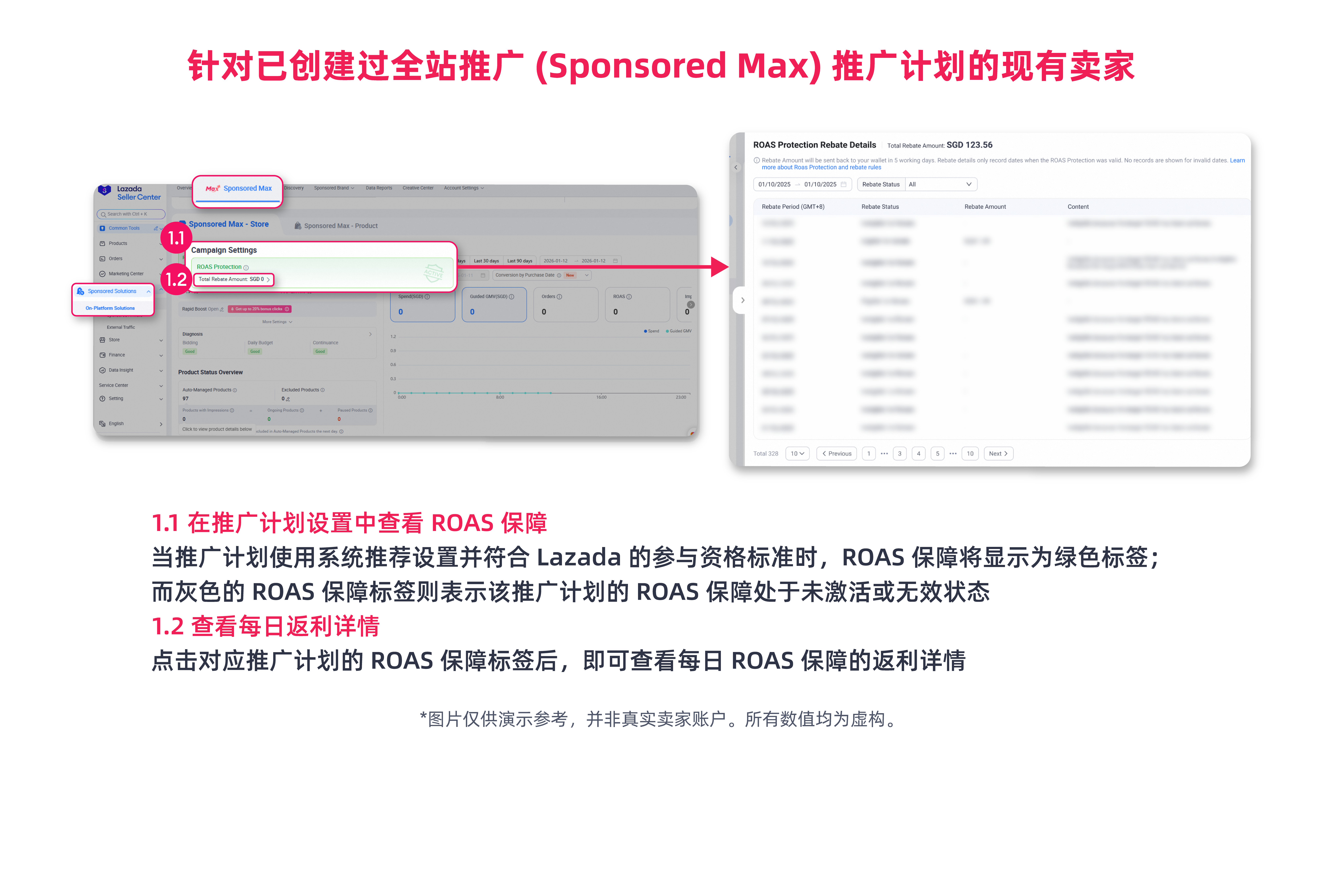 保障ROAS 机制 (ROAS Protection) 是为在全站推广 中使用 Target ROAS 出价类型的商家提供的保障机制,旨在确保最低的 ROAS 水平。如果符合条件的推广计划未能达到设定的阈值(取决于适用标准),Lazada 将以 LSS 代金券的形式向卖家返利部分推广计划消耗。