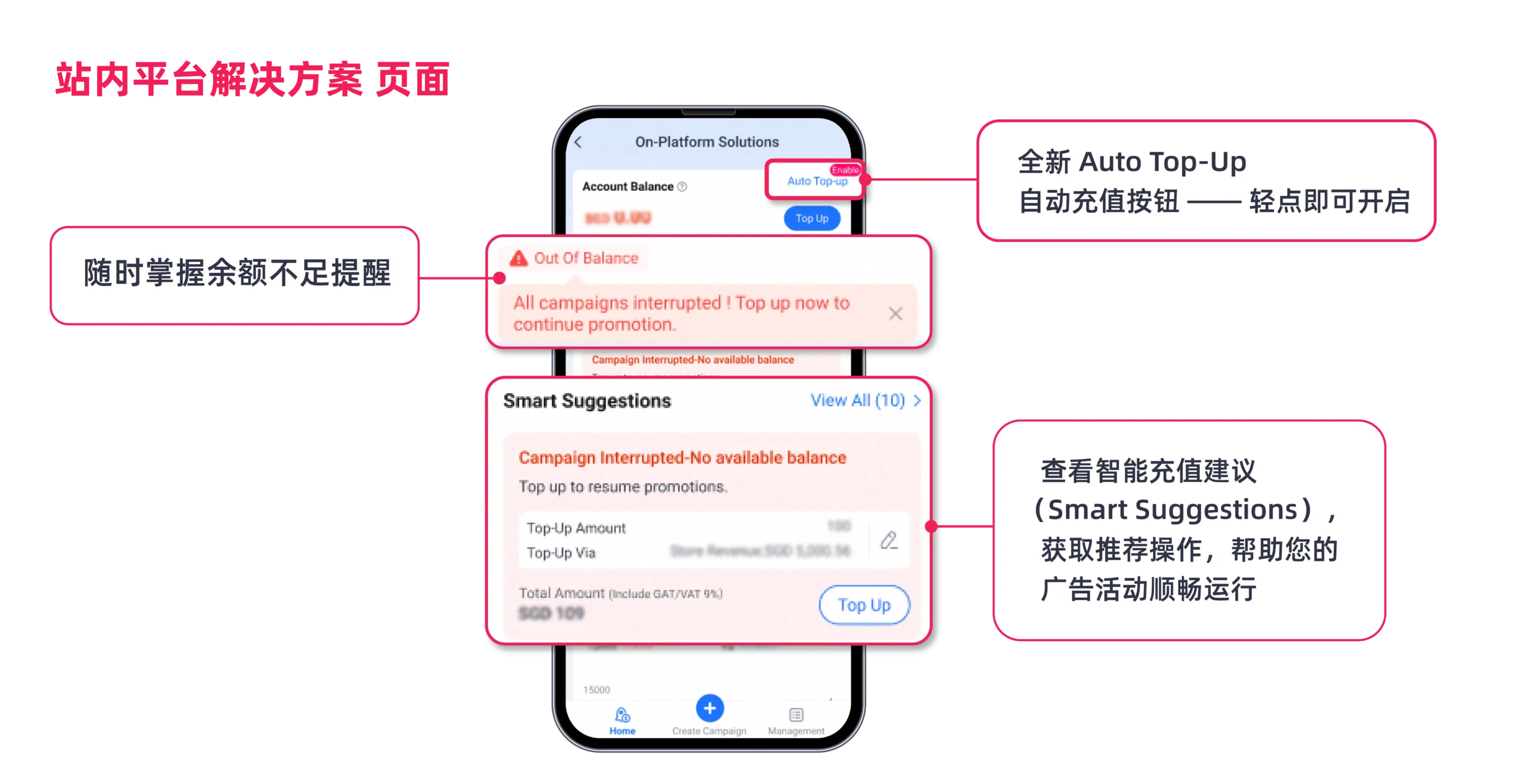 Lazada 商家中心移动应用的 On-Platform Solutions 新功能将从 11 月 20 日起陆续上线,帮助您更高效地管理广告活动与账户余额。
