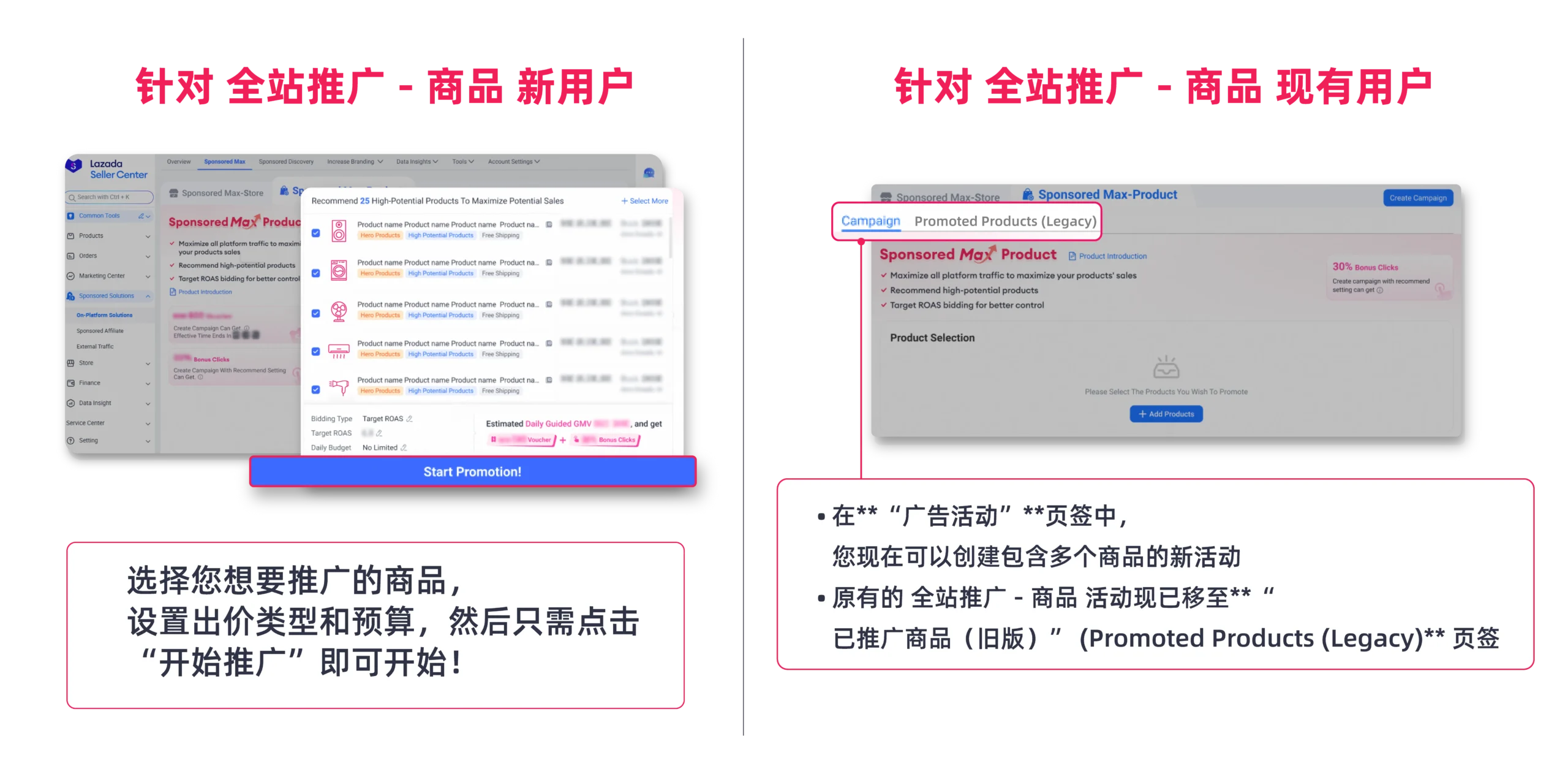 答: 为了防止重复投放,如果某个正在推广的商品被选中加入新的 全站推广 – 商品 活动,原有的广告活动将被系统自动暂停或移除。您可以在“广告活动”页签下找到新的活动,而原有的(已暂停)活动将被移至“推广商品(旧版)” (已推广商品 (Legacy)) 部分。