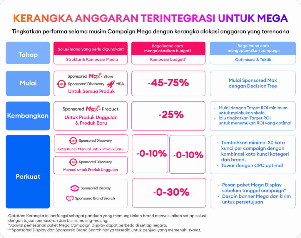 Tingkatkan anggaran harian dan pastikan saldo mencukupi untuk Sponsored Max dan MSA selama Mega Campaign agar visibilitas dan performa penjualan tetap maksimal.