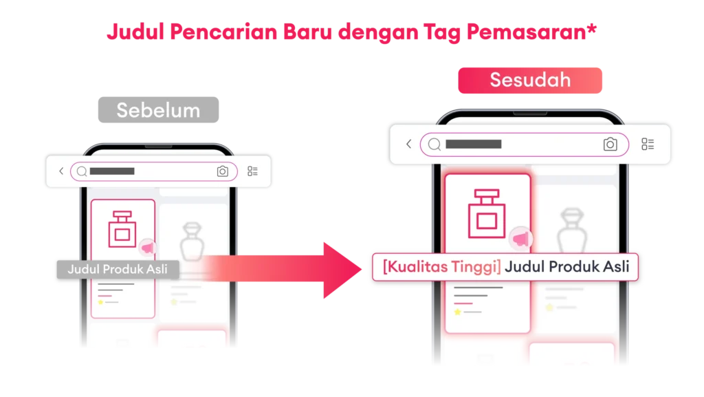 Semua tag pemasaran menggunakan format tampilan yang konsisten: [Marketing Tag] + Judul Produk Asli