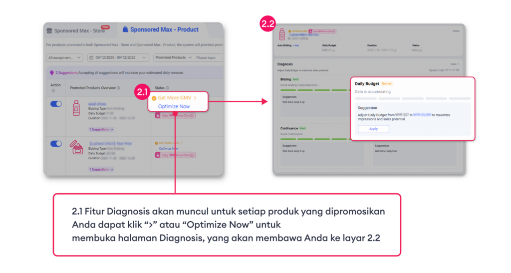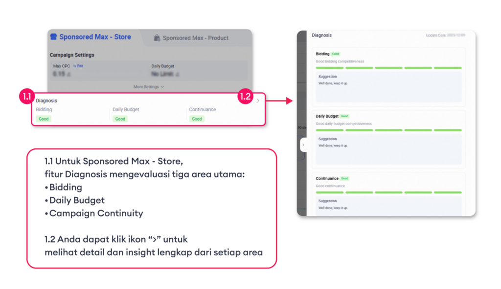 Fitur Diagnosis kini tersedia untuk Sponsored Max – Store dan Sponsored Max – Product. Fitur ini membantu Anda memahami performa campaign dengan lebih mudah melalui identifikasi masalah dan peluang peningkatan. Dengan insight personal dan rekomendasi yang jelas, Anda dapat mengoptimalkan campaign Sponsored Max dengan lebih percaya diri dan memperoleh hasil yang lebih baik.