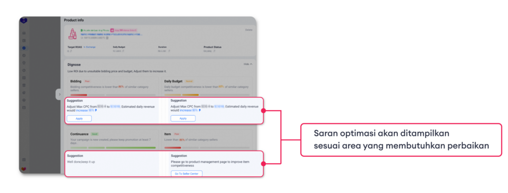 Memberikan langkah-langkah praktis yang dapat diterapkan, seperti menaikkan bid, menyesuaikan Budget harian, meningkatkan daya saing produk, atau memastikan campaign berjalan terus-meneru