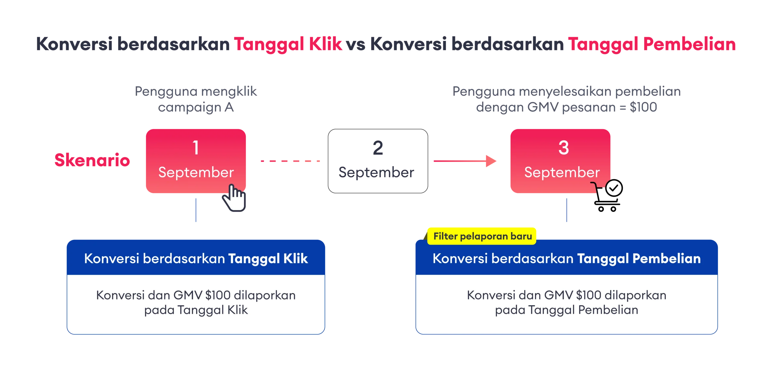 Konversi berdasarkan Tanggal Pembelian: Konversi diberikan atribusi pada tanggal transaksi diselesaikan. Metrik konversi akan muncul lebih dekat dengan waktu saat hasil bisnis sebenarnya terjadi. Ini meningkatkan keselarasan dengan GMV toko, mempercepat visibilitas kinerja, dan mendukung evaluasi ROAS/ROI yang lebih akurat.