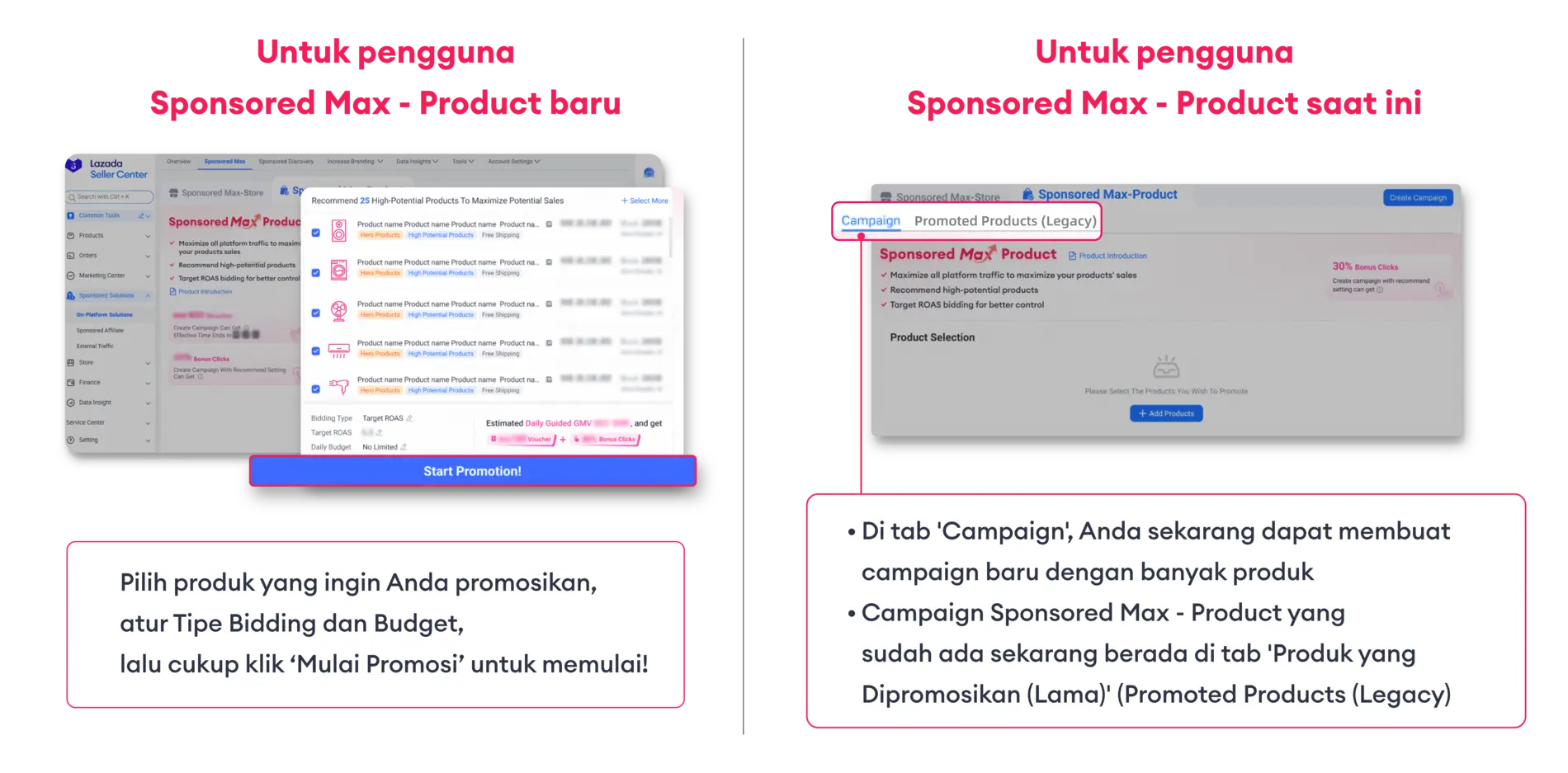 J: Untuk mencegah tumpang tindih, jika produk aktif dipilih untuk campaign Sponsored Max – Product yang baru, campaign asli akan dijeda atau dihapus secara otomatis oleh sistem. Campaign baru dapat ditemukan di bawah tab ‘Campaign’, sementara campaign asli (yang dijeda) akan dipindahkan ke bagian ‘Produk yang Dipromosikan (Lama)’ (Promoted Products (Legacy)).