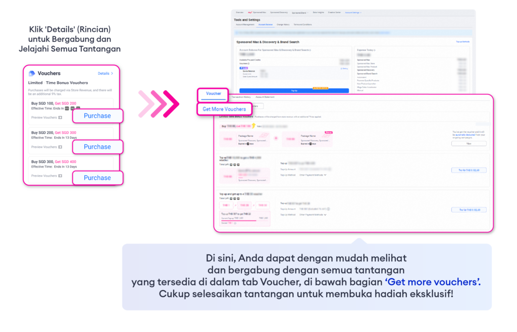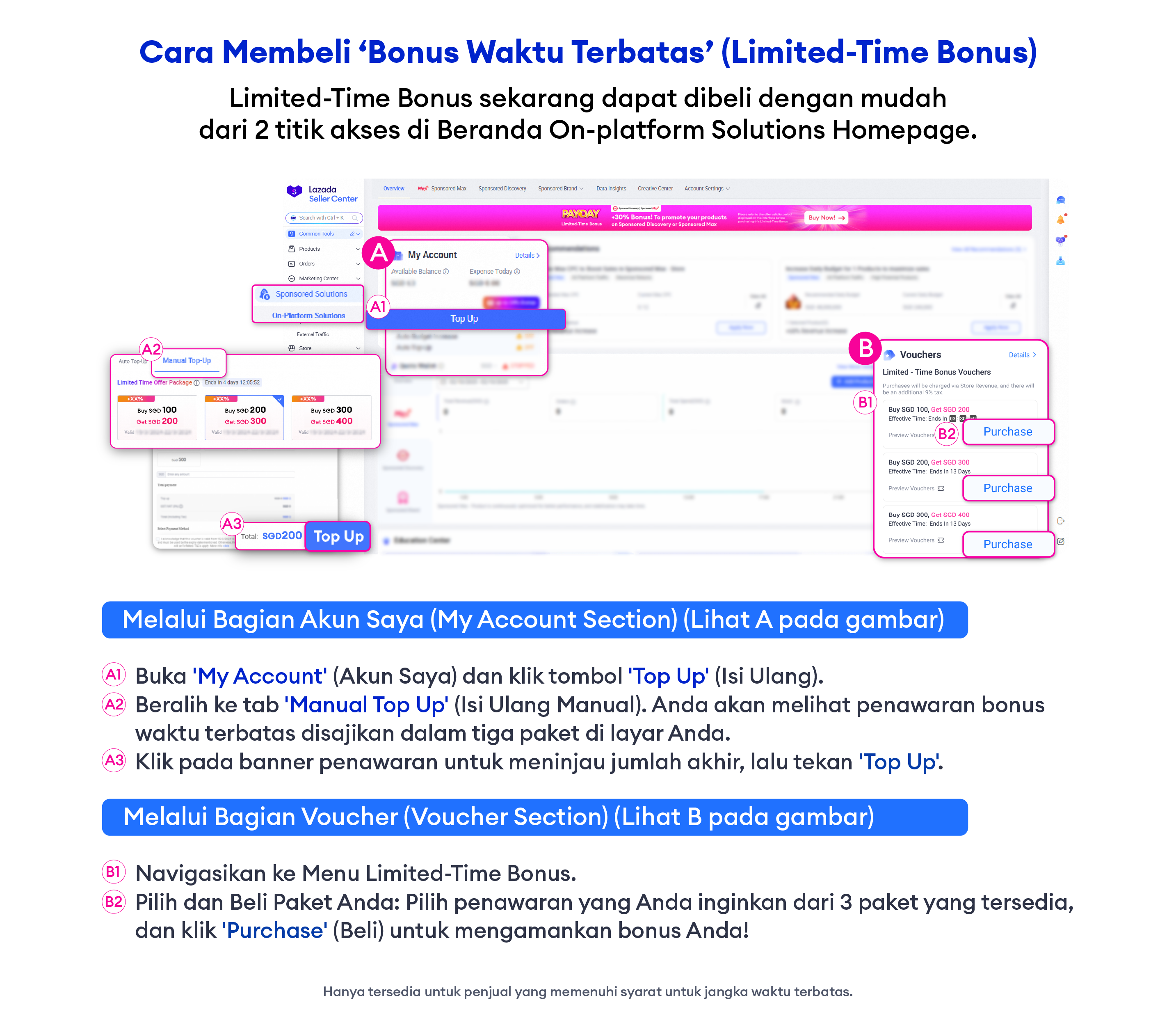 Limited‑Time Bonus adalah promosi bonus isi ulang khusus yang tersedia dalam periode terbatas. Penjual yang membeli isi ulang melalui Bonus ini akan menerima nilai bonus tambahan atas jumlah pembelian. Voucher berlaku untuk kampanye Sponsored Discovery dan Sponsored Max.