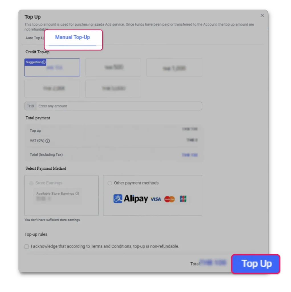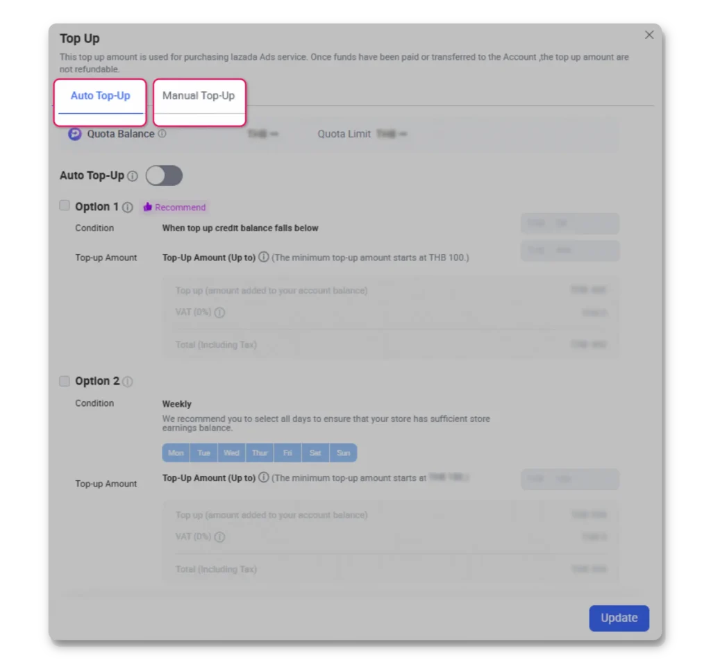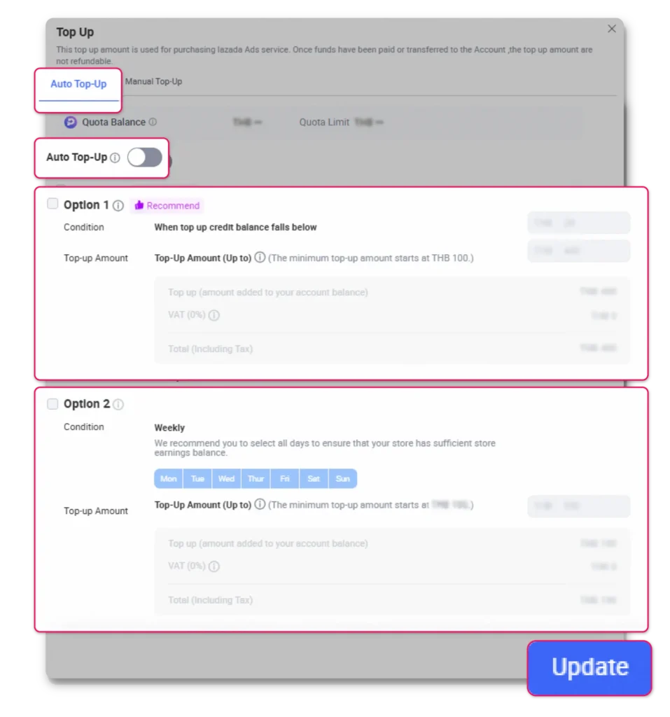 Efficiently drive traffic and sales through automated budget management with two comprehensive top-up methods available via Lazada Seller Center website or mobile application.