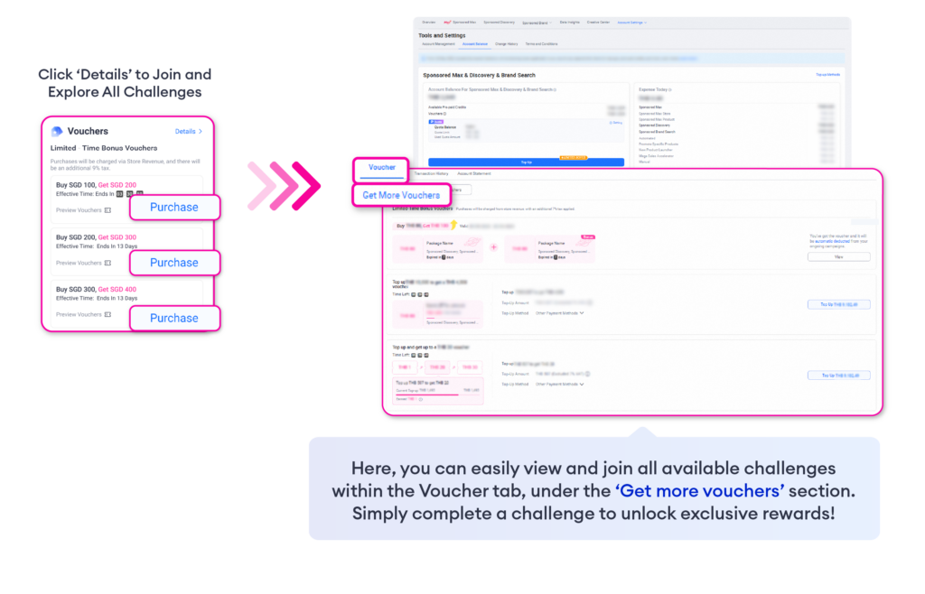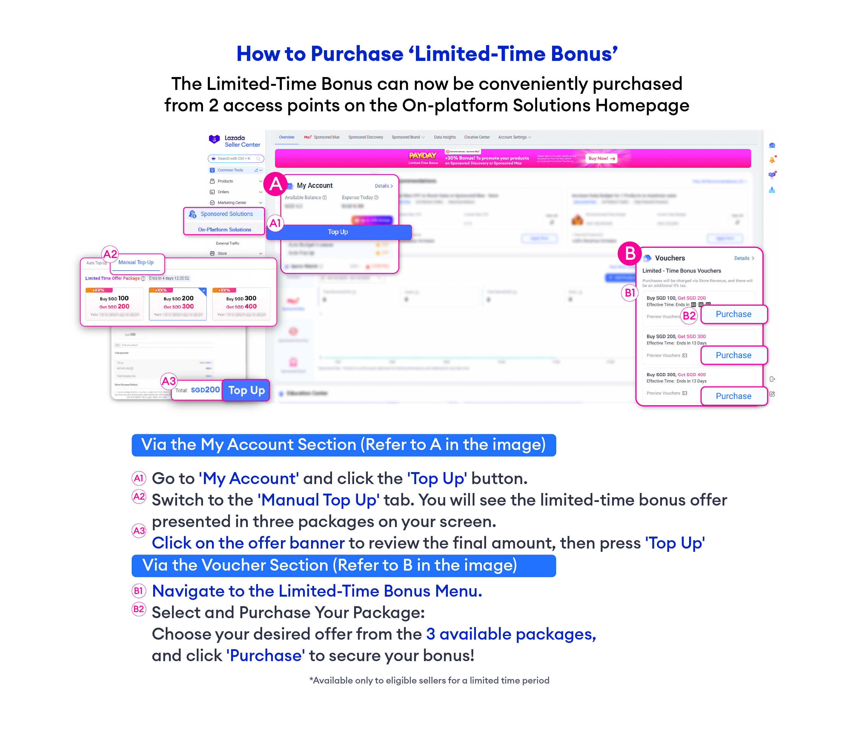 Limited-Time Bonus is a special top-up bonus promotion available during a specific period. Sellers who purchase a top-up through the Limited-Time Bonus will receive additional bonus value on top of the purchase amount. The vouchers are applicable to Sponsored Discovery and Sponsored Max campaigns.