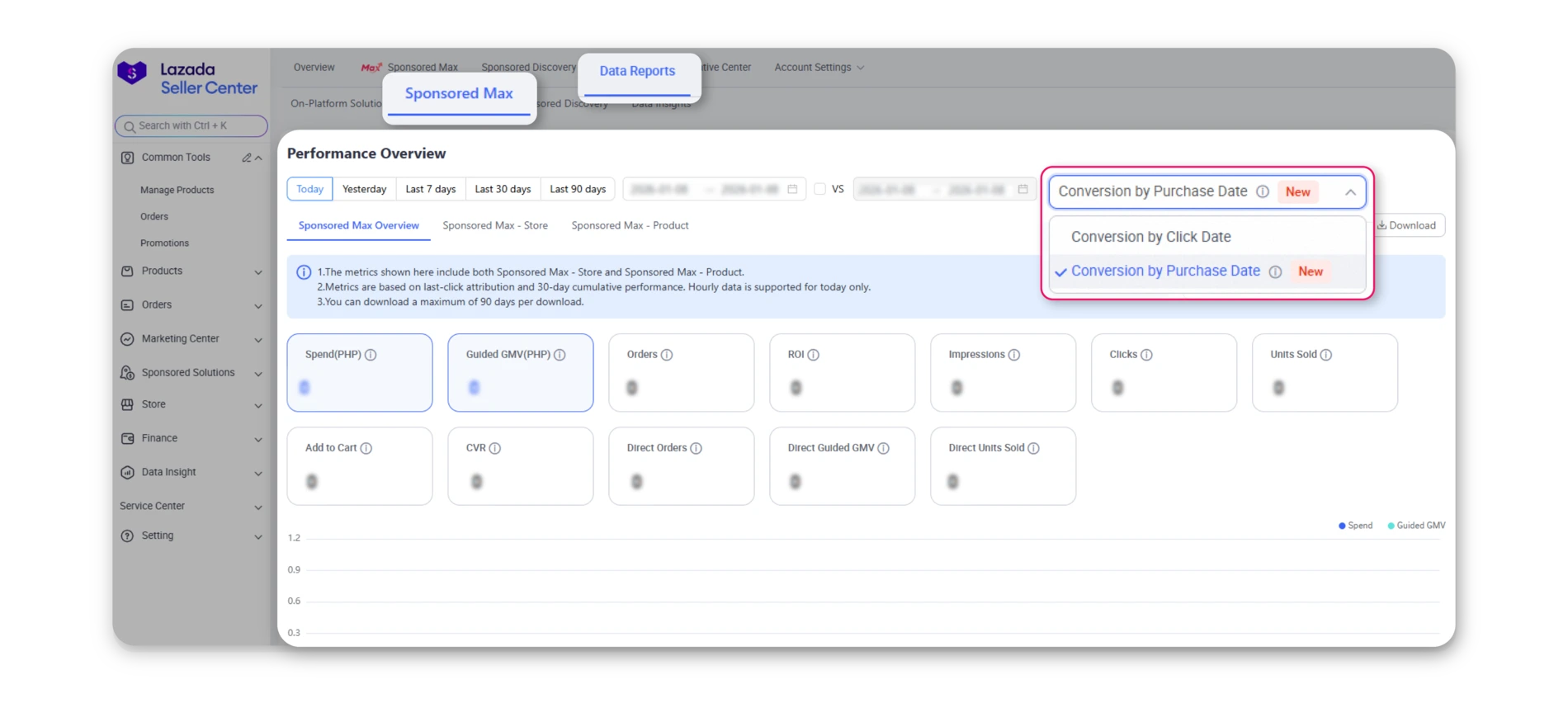 Note: Sponsored Max metrics remain based on a 30-day last-click attribution window. This update only impacts conversion reporting, affecting GMV, Orders, and related metrics, such as ROI and CPO, that rely on these for calculation.