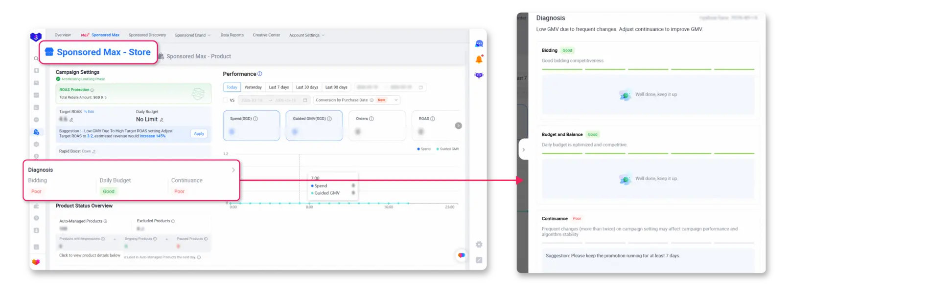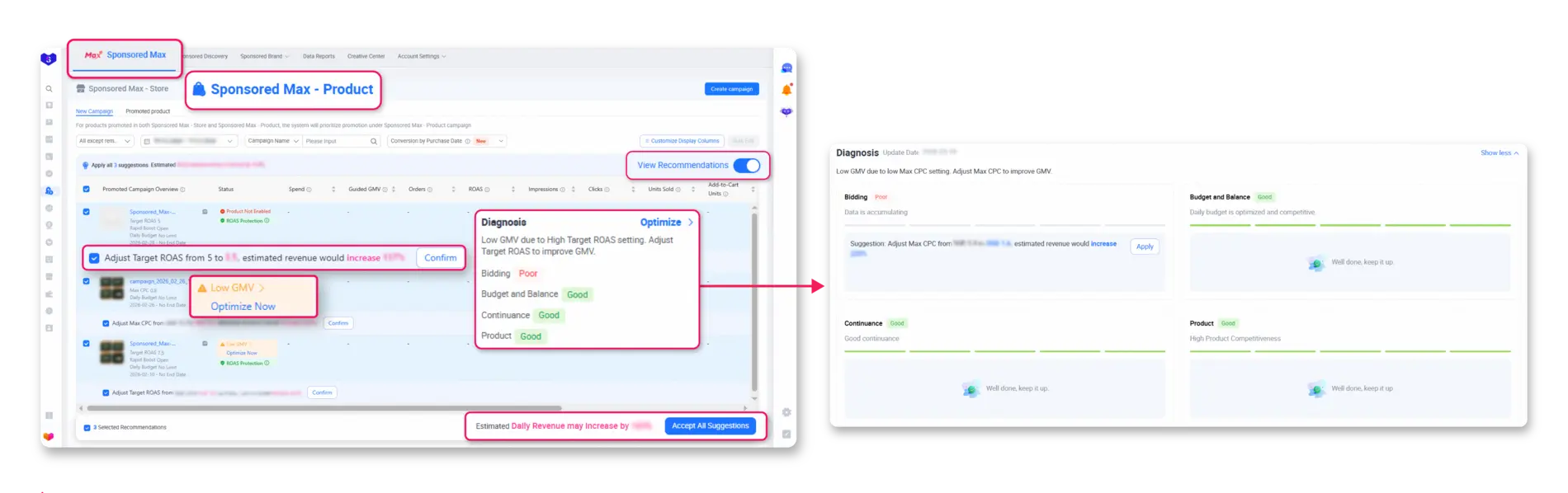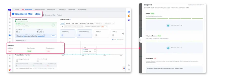 The Sponsored Max Diagnosis Feature has been upgraded to help you optimize your campaigns more efficiently with personalized insights and guided recommendations