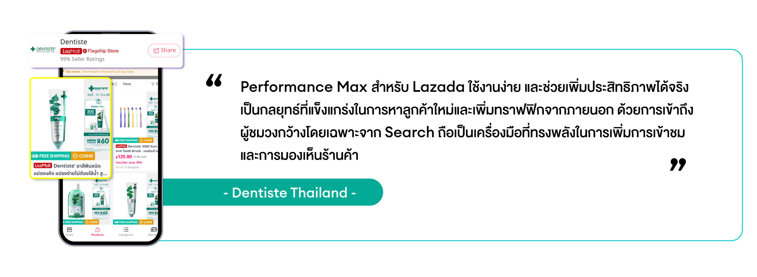 Dentiste ใช้ Performance Max สำหรับ Lazada เป็นหัวใจของกลยุทธ์ในการหาลูกค้าใหม่ ตั้งค่าง่ายๆไม่ยุ่งยาก แคมเปญก็จะทำงานอัตโนมัติ ปรับงบประมาณและครีเอทีฟอย่างต่อเนื่องบน Google Search, YouTube และ Display เพื่อเข้าถึงผู้ซื้อที่มีความสนใจสูง