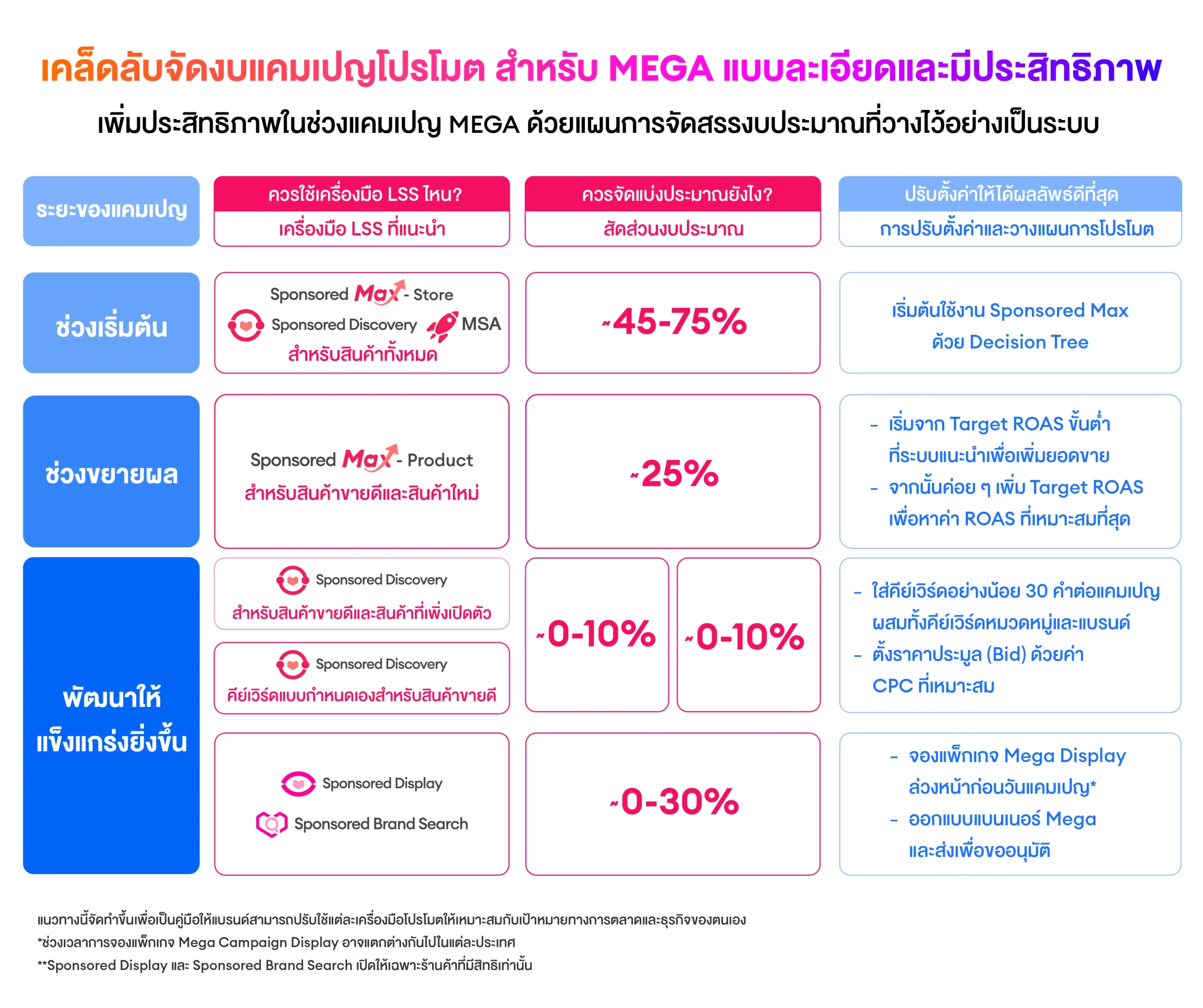 เพิ่มงบประมาณรายวันและตรวจสอบให้แน่ใจว่ามียอดเงินเพียงพอสำหรับ Sponsored Max และ MSA ตลอดช่วงแคมเปญ Mega เพื่อให้แคมเปญของคุณมองเห็นได้มากที่สุดและทำยอดขายได้เต็มประสิทธิภาพ