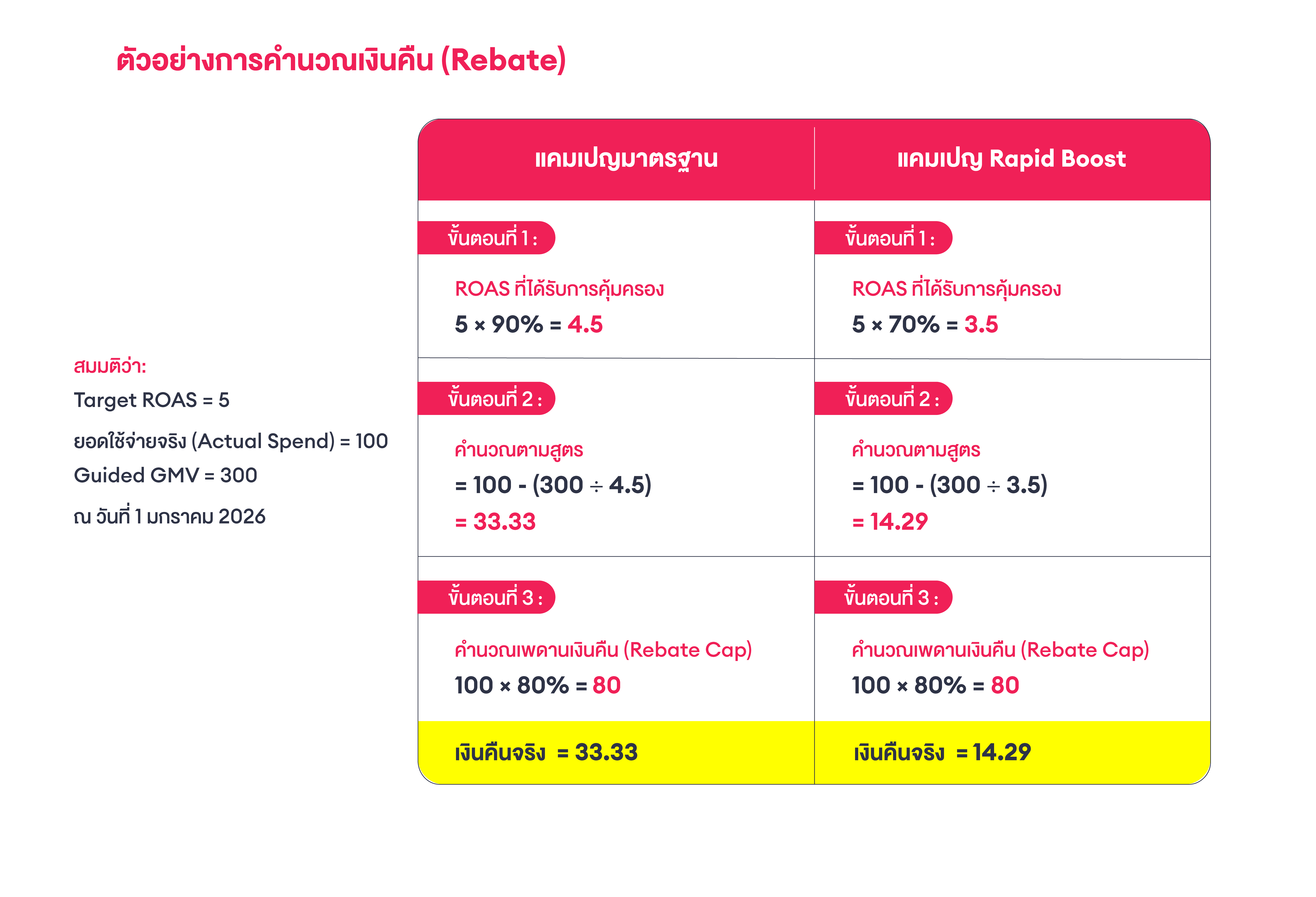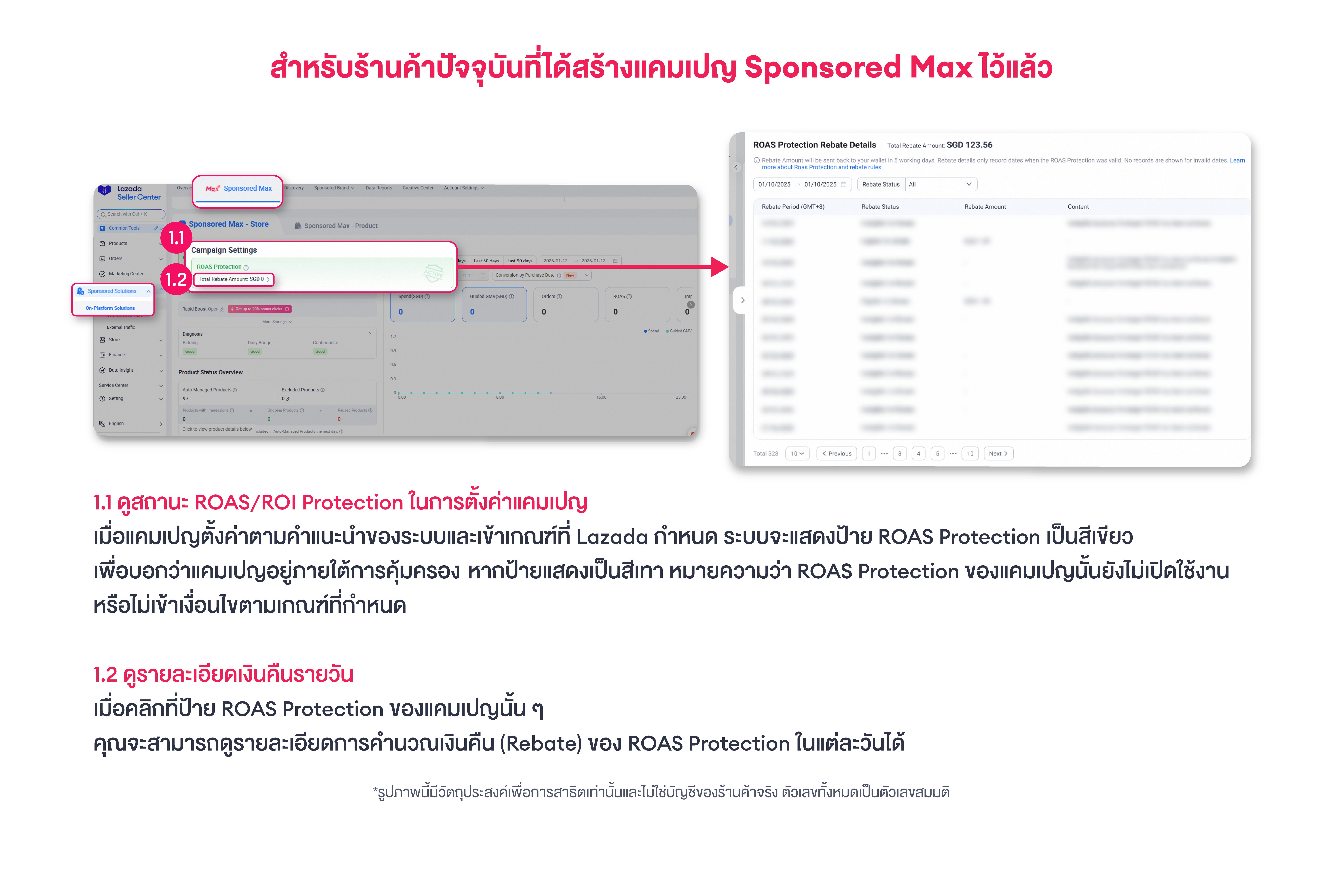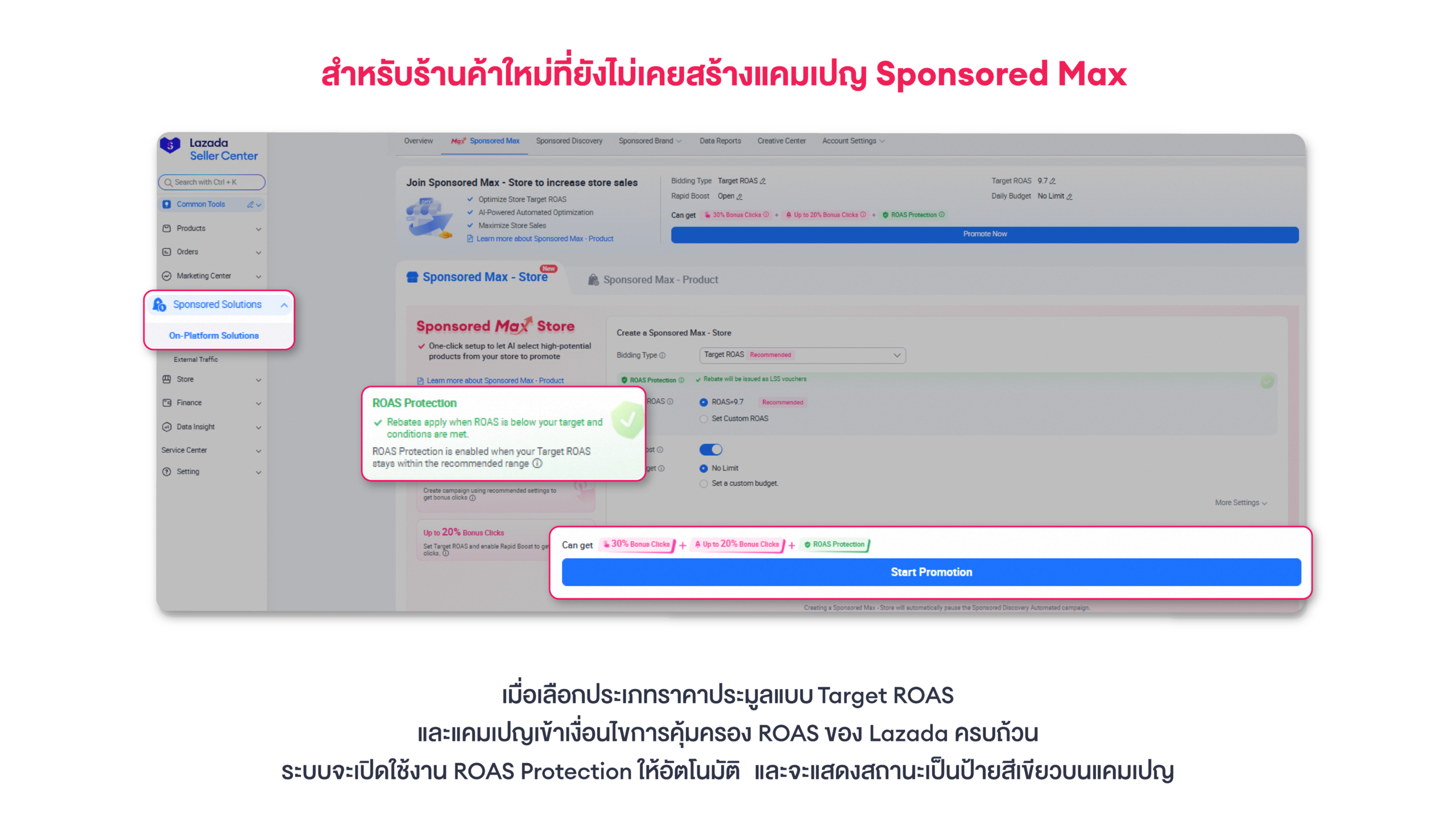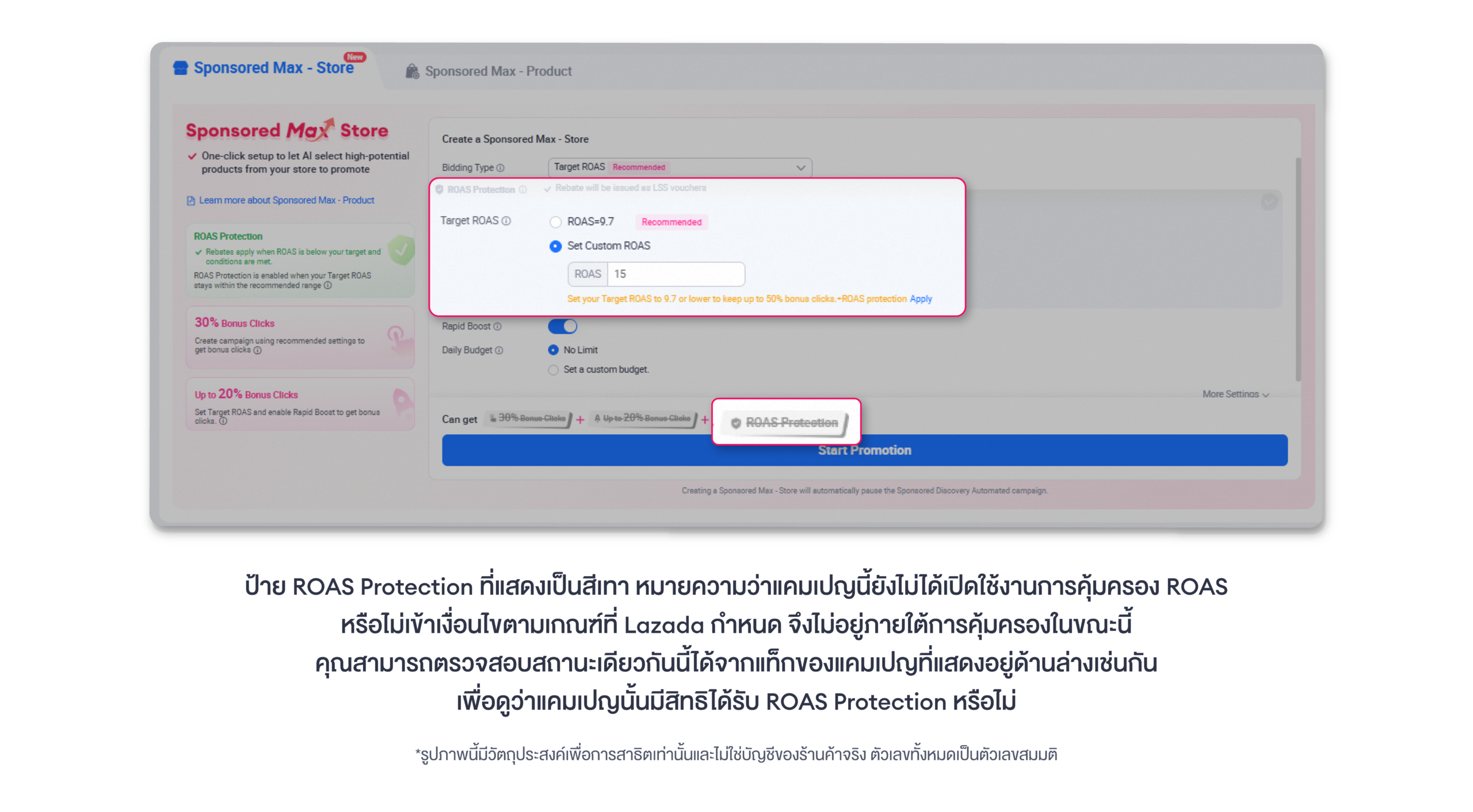 Sponsored Max มีกลไกการคุ้มครอง ROAS (ROAS Protection) สำหรับร้านค้าที่ใช้ประเภทราคาประมูลแบบ Target ROAS เพื่อช่วยให้ร้านค้ามั่นใจว่าจะได้รับ ROAS ขั้นต่ำสำหรับแคมเปญโปรโมตสินค้า ในกรณีที่แคมเปญเข้าเงื่อนไข แล้วมีผลลัพธ์ ROAS ต่ำกว่าระดับที่กำหนดไว้ (ภายใต้เงื่อนไขที่ระบบกำหนด) Lazada จะคืนค่าใช้จ่ายส่วนต่างบางส่วนให้กับร้านค้า ในรูปแบบของ LSS Voucher