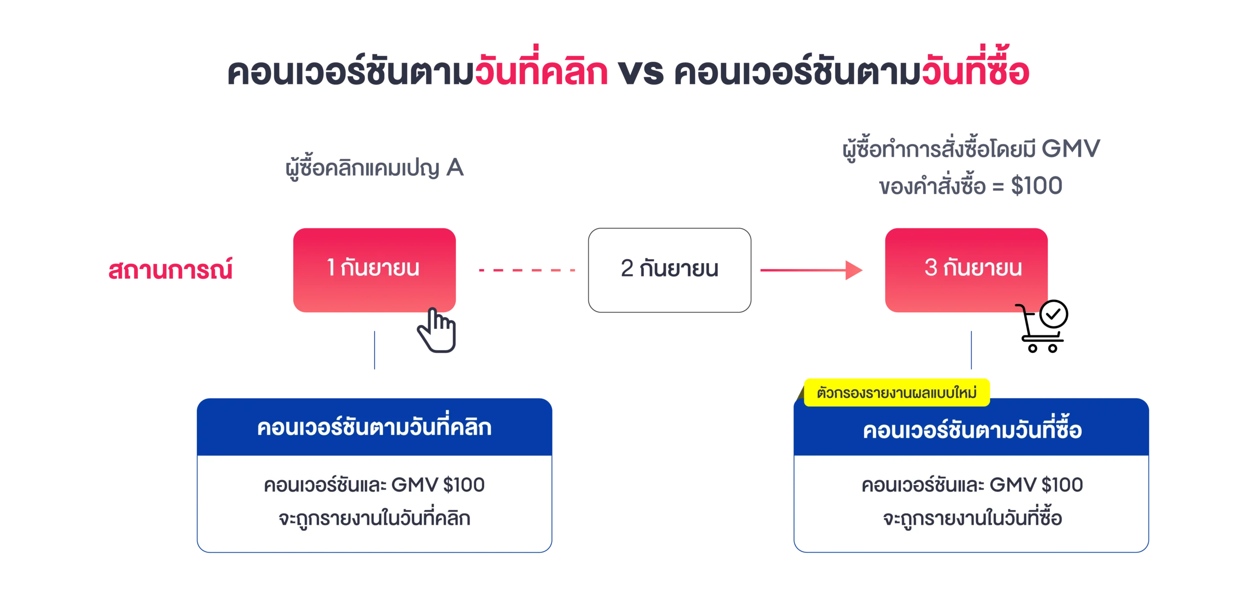 ระบบจะแสดง Conversion และ GMV ในวันที่ลูกค้าทำรายการซื้อสำเร็จ คือวันที่ 3 กันยายน ซึ่งสะท้อนช่วงเวลาที่เกิดยอดขายจริง ในกรณีนี้ GMV มูลค่า 100บาทและ Conversion จะถูกนับและแสดงในวันที่ 3 กันยายน ทำให้ข้อมูลสอดคล้องกับผลประกอบการของร้านมากขึ้น